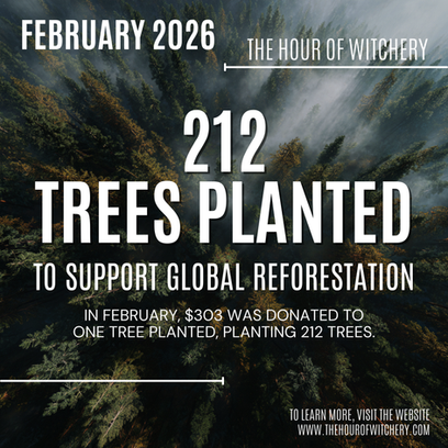 Donations are made monthly, with a portion of total orders contributed at the end of each month. After each donation, The Hour of Witchery receives an official certificate from One Tree Planted verifying the number of trees planted, which will be displayed on this page for continued transparency and accountability.